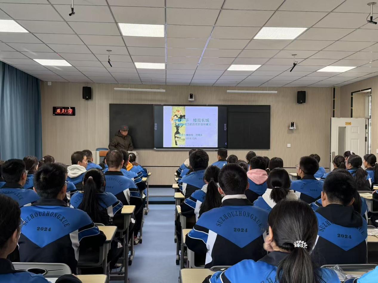 在长城主题讲座环节,博物馆社教老师通过生动的讲述与珍贵的影像资料,带领同学们“穿越”古今,深入了解了肃州境内长城的营建历史、建筑智慧及背后的文化内涵。同学们凝神聆听,仿佛看到了昔日烽火台上的守望,听到了丝绸之路上商队的驼铃声。一段段鲜为人知的历史细节,让肃州长城不再是教科书上的遥远存在,而变成了可感可知的家乡记忆。