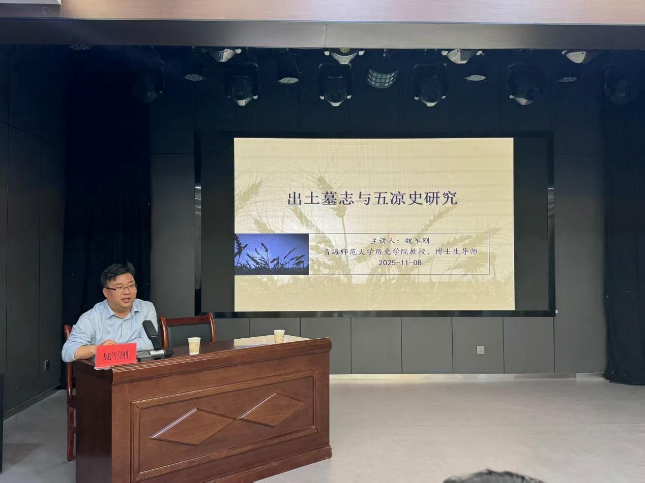 在学术研讨环节,杨院长以“《李伯钦墓志》与西凉政权相关问题”为主题,从李伯钦家世与陇西李氏、墓志所见西凉大族政治联姻、墓志所见西凉职官和封爵以及后西凉政权与西域政局四个方面进行讲述,以单一方墓志为突破口,对推进西凉史的研究有积极意义;青海师范大学历史学院教授、博士生导师魏军刚则从五凉史的墓志概观、十六国五凉政权概述等方面论述了出土墓志与五凉史的相关研究,不仅深化了对五凉政权历史地位的认知,更确立了出土文献在十六国史研究中的核心价值。研讨会结束后,青海师范大学专家学者们走进肃州区博物馆文物展厅,重点观摩馆藏文物“李超夫人尹氏墓表”和“李礼墓志”,就这两件文物所具有的形制特征、史料价值、书法艺术展开深度研讨,对文献精度与艺术高度的珍贵碑刻给予高度评价。